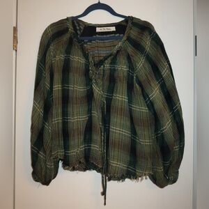 Lightweight plaid peasant blouse with relaxed silhouette. Balloon sleeves and tie-front detail. Raw hem for a lived-in look. Soft woven fabric with subtle texture.