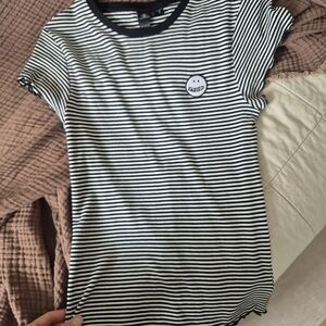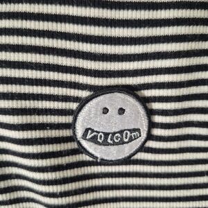 Black and white striped short sleeve tee by Volcom. Contrasting black ringer neckline. Slim, fitted silhouette with small embroidered patch. Soft knit fabric for everyday wear.
