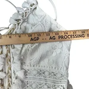 Features intricate floral crochet lace, adjustable spaghetti straps, and a flattering smocked back for an easy, flowy fit. Finished with braided tassel ties + soft pom pom details for that perfect Free People–inspired festival / beach bridal aesthetic.