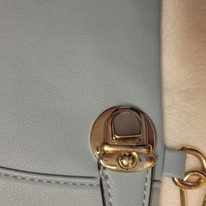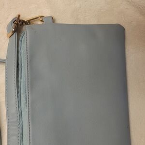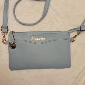 Sleek Willow crossbody in soft powder blue. Smooth faux leather body with gold-tone accents. Detachable strap for multiple carry options. Top zip closure keeps essentials secure. Clean, modern design for everyday use.