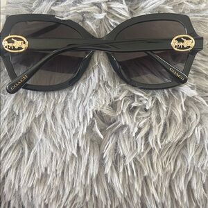 Coach cat-eye sunglasses. Glossy black plastic frame. Dark smoke gradient lenses. Includes Coach hard case and paperwork. Stylish everyday accessory.