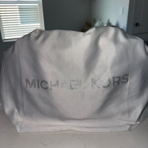 Structured Saffiano leather satchel by Michael Kors. Gold-tone logo and hardware accents. Dual top handles with a detachable shoulder strap. Sleek silhouette for everyday or work wear. Timeless black finish pairs with many outfits.