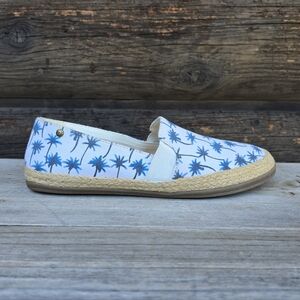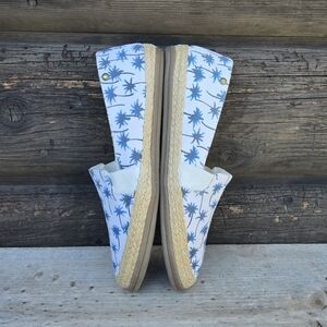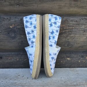 coastal preppy, palm print, espadrille slip on, resort casual, beachy flats, tropical print loafers, summer slip ons, nautical inspired, vacation style, blue white flats