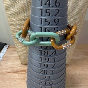 This bracelet offers a bold design with its green and brown enamel links accented by rhinestones. Slightly imperfect, it remains a stylish statement accessory.