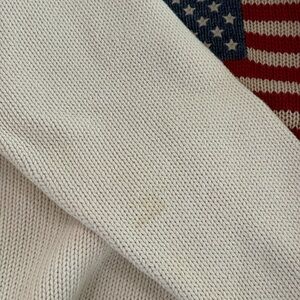 Cozy cream turtleneck sweater from Ralph Lauren. American flag knit on front in red and blue. Chunky ribbed collar and soft knit body. Casual, patriotic style for layering.