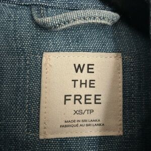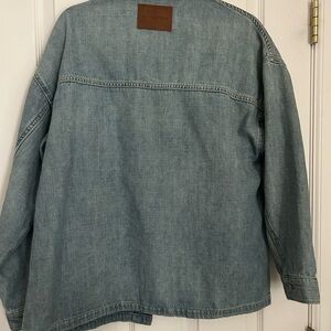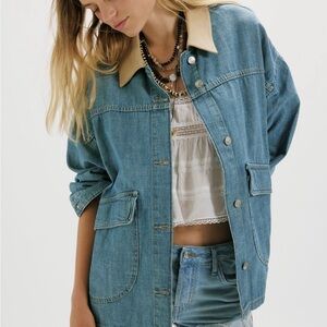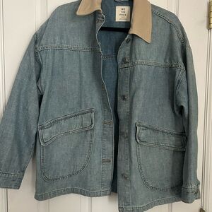 Relaxed light blue denim jacket with a contrasting tan collar. New without tags, size XS, color berry blue.
