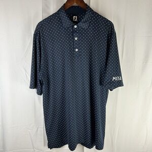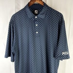 FootJoy Mens Golf Polo Sz XL Navy/White Geometric Diamond Print Mesa. Condition is Pre-owned - Good. Has a hole on back left sleeve and one on back left side (see pictures). Has embroidery of Mesa. Shipped with USPS Ground Advantage.