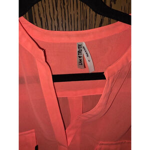 This is a coral-colored women's blouse by Live 4 Truth, size L, made from 100% polyester. The sheer fabric features a V-neckline and three-quarter sleeves with buttoned cuffs. Two functional chest pockets are adorned with gold-toned, L-shaped metal accents.The garment is in new condition with no visible signs of wear.