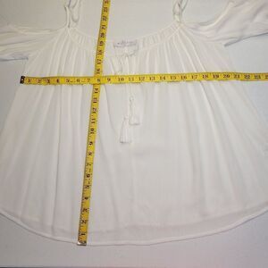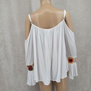 Embrace a bohemian vibe with this elegant white cold shoulder top. Perfect for casual outings, it features colorful crochet accents for a unique touch.