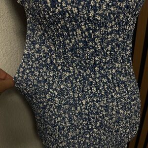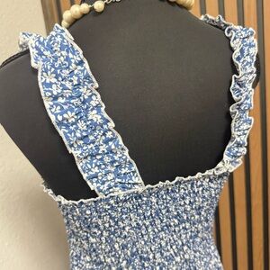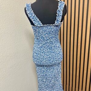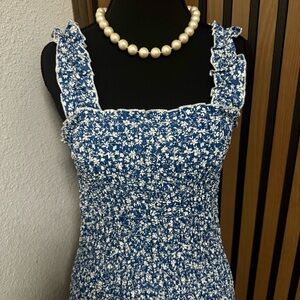 Sleeveless smocked midi dress with ruffled straps. Blue base with small white floral print. Form-fitting silhouette. Feminine and versatile. Great for summer can fit XS and S