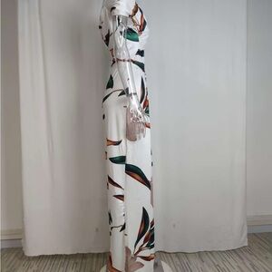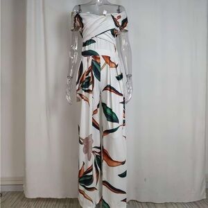 Effortless tropical jumpsuit with a white base and bold green and brown leaf print. Off-shoulder neckline and wide-leg silhouette for a relaxed, flattering fit. Lightweight, breathable fabric perfect for warm-weather events. Versatile style that dresses up with heels or down with sandals.