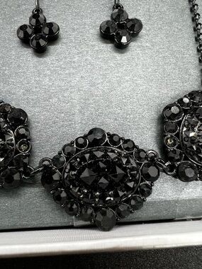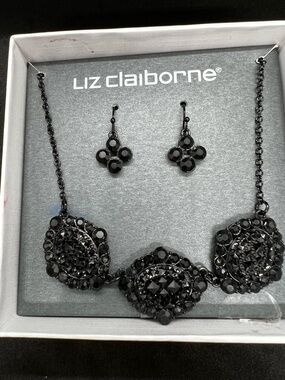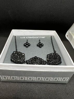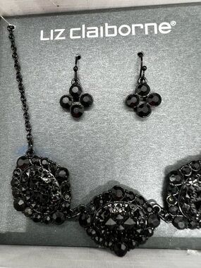 VTG Liz Claiborne Black Statement Necklace & Earrings Set Gunmetal Crystal