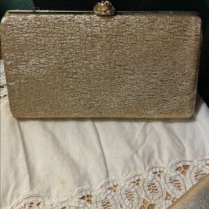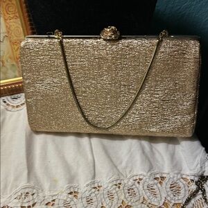 Sleek vintage clutch with a textured metallic surface. Decorative floral clasp and slim chain handle. Refined gold tone for dressy occasions.