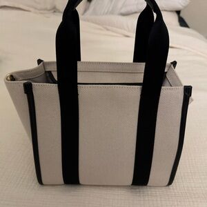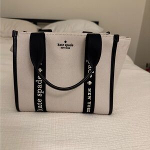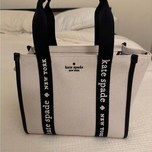 Tote bag with black straps. Kate spade logo on the straps. You can use it as a hand bag or as a crossbody. It comes with black straps that you can add on to it.