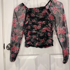 Art Class Girls Black Floral Mesh Ruched Long Sleeve Top Size M 7/8