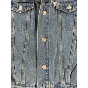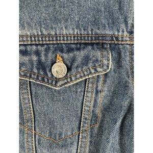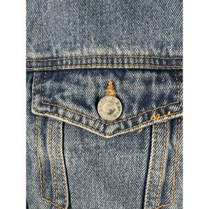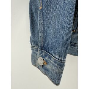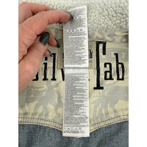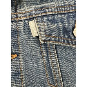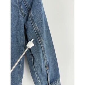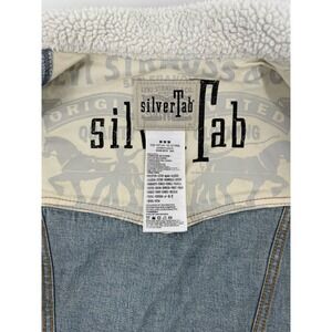 The VTG Levi's Silver Tab Trucker Jean Jacket is a denim jacket with a sherpa collar, perfect for youth aged kids between 10-12 years old. This vintage piece features a solid blue color with a polyester lining, making it suitable for all seasons. The jacket has long sleeves, a button closure, and is machine washable for easy care. With a classic western and grunge style, this jacket is versatile for casual, workwear, and travel occasions. The Levi's brand adds authenticity to this timeless piece, which includes accents like branded buttons and logos.