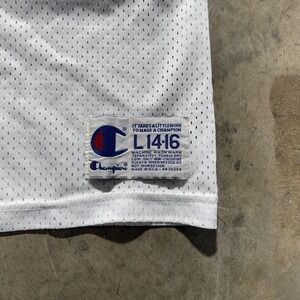Champion brand, authentic athletic apparel. Made in USA. Size tag reads L 14-16 (Youth Large). Features mesh body, satin shoulders, and screen-printed numbers and name. Classic Green Bay Packers striping at sleeves. Brett Favre #4 across front and back, 'FAVRE' on nameplate.