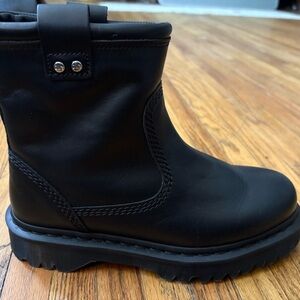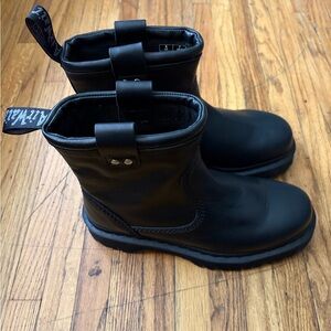 Classic Dr. Martens ankle boots in smooth black leather. Slip-on Chelsea style with pull tabs. Durable chunky sole with signature welt stitching. Sleek, minimalist silhouette for everyday wear.