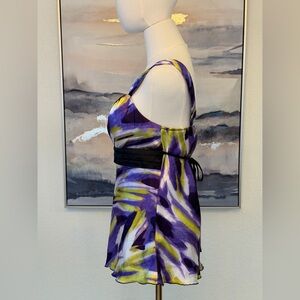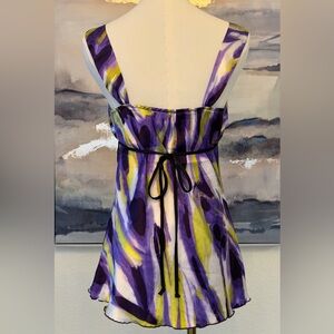 Super cute early 2000s BCX babydoll tank in a dreamy purple and lime abstract / watercolor print. Features a flattering empire waist with a flowy, lightweight fit that gives that perfect Y2K coquette, fairycore, and soft grunge vibe. Soft, slightly silky fabric with a feminine drape—perfect for going out, layering, or festival looks.
