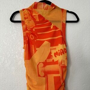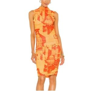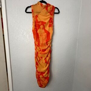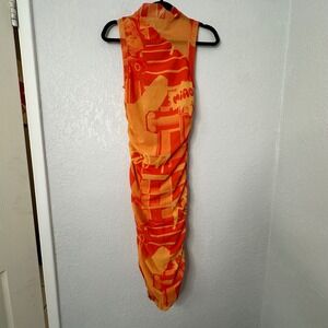 Miaou Orange Graphic Print Ruched Mock Neck Sleeveless Midi Dress Size S