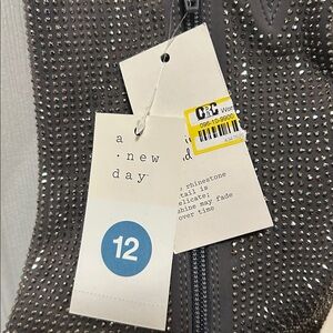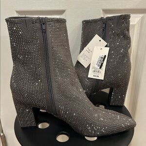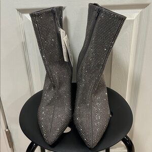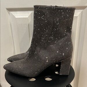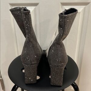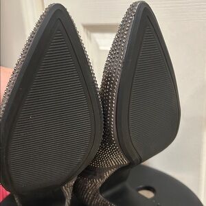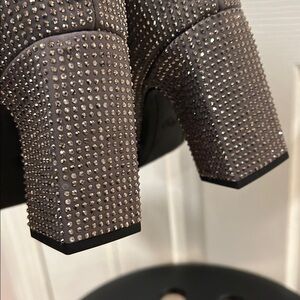 3.5 inch block heel. Rhinestone-covered stretchy fabric upper. Pointed toe.