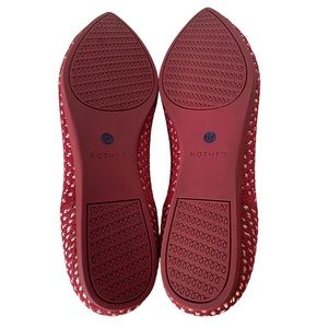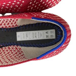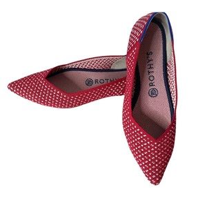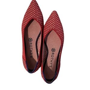 Sleek pointed-toe flats by Rothy's. Knit upper with red and white pattern. Slip-on style with low profile. Cushioned insole for comfort. Versatile and breathable for daily wear.