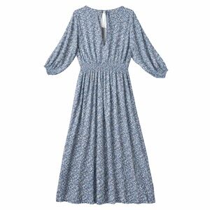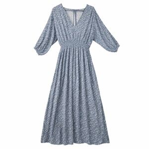 Soft blue maxi dress with a small floral print. V-neckline and smocked waist. Three-quarter sleeves and flowing skirt. Lightweight and breezy for everyday wear.
