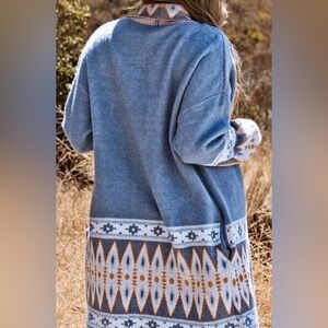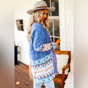 Cardigan Aztec Sweater ~ Long Sleeve Tribal Print Wool Knit Open Front in Blue