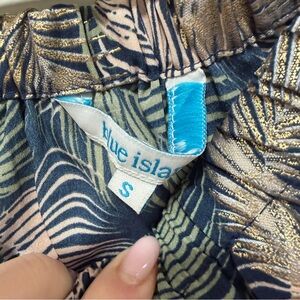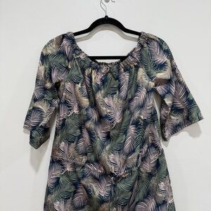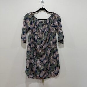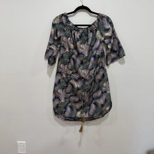 Blue island Tropical Leaf Print Mini Dress Boho Cinched Waist Tassel Tie Small