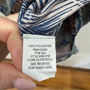 • Beautiful tropical leaf print in navy, sage green, taupe, and soft blush tones