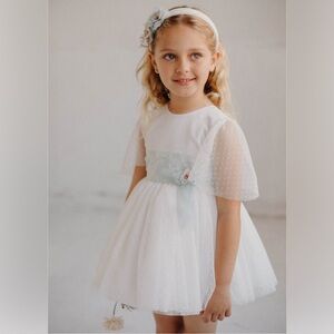 Elevate your little one's look with the Cortejo Girls' Dress, crafted in elegant polka dot tulle featuring a charming combination of aquamarine and ivory tones. Perfect for special occasions, this dress blends timeless sophistication with a fresh, modern flair. The delicate polka dot accents add a whimsical touch to its graceful design.