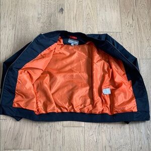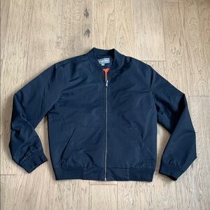 Classic navy bomber jacket with a contrasting orange interior. Lightweight and versatile for everyday wear. Features a full front zipper and ribbed cuffs and hem for a comfortable fit. Navy exterior pairs easily with casual or smart-casual looks.