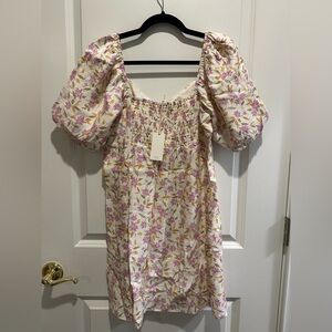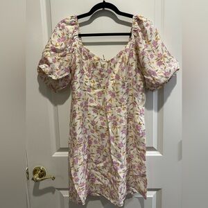 Z Supply mini dress in a soft cream base with pink and mustard floral print. Features a scoop neckline and puff sleeves. Lightweight, breathable fabric with a relaxed, feminine silhouette. Easy to style for daytime events or casual outings.