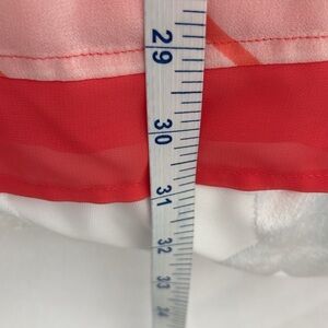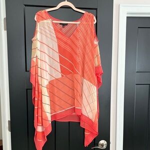 Lane Bryant (Plus Size) Coral & Cream/Off White Geometric Asymmetrical Sheer Tunic. Size 22/24. Stylish V-neck tunic with a bold geometric pattern. Flowy and elegant design. Very lightweight. This is oversized, which you’ll notice in photo with arm pit to arm pit measurement. It will fit closer to the body when worn.