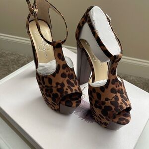 High platform sandals by Jessica Simpson. Peep-toe silhouette with T-strap. Adjustable ankle buckle for a secure fit. Chunky block heel for stability. Bold leopard print for statement style.