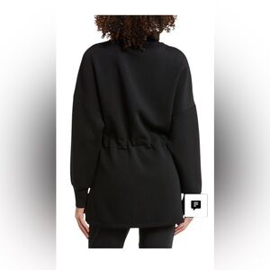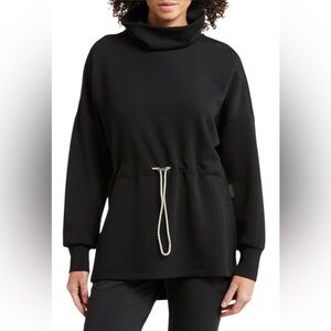 A supremely soft knit provides endless comfort in a contemporary sweatshirt with a funnel neck, side slits and adjustable drawcord with toggle at the waist.