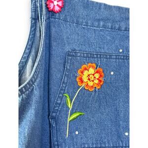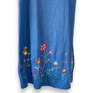 This is a charming vintage denim jumper dress from Quacker Factory, a brand famous for its whimsical and detailed embellishments. The dress features a classic overall-style bodice with a front bib pocket and side button closures. The medium wash denim serves as a canvas for vibrant, multi-colored floral embroidery and a small bumblebee motif at both the chest and the lower hemline. Its maxi length and side slit offer a relaxed, cottagecore or teacher-chic aesthetic that is both nostalgic and functional.