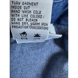 The garment appears to be in excellent vintage condition. The denim maintains a consistent wash without significant fading or distressing. The embroidery remains intact with vibrant colors, and the original buttons are present. Always mention that as a vintage item, there may be minor signs of natural wear, though none are visible in the provided photos.