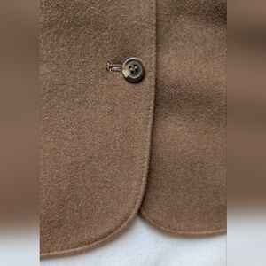 Vintage Pendleton wool blazer/jacket in a warm camel-brown tone. Classic minimalist style with a clean front, structured shoulders, and front button closure. Features buttons at the end of the sleeves and brown lining inside. Two front packets. Made in USA from 100% virgin wool by Pendleton Woolen Mills. Dry clean only. A timeless tailored wool piece that works well for fall and winter layering.