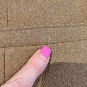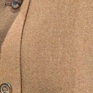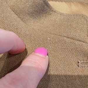 Good pre-owned condition. No holes or major stains. There are two small whitish dots near the right side of the collar. On the left side of the jacket near the buttons there are two small dots with a short line in the fabric. The most visible mark is on the left pocket area (pictured). Overall still in good wearable condition.