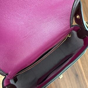 Coach two-tone leather crossbody in fuchsia and brown. Features gold-tone hardware and signature turn-lock closure.