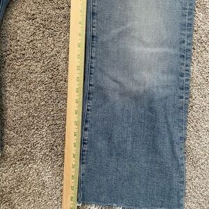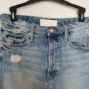 High-rise wide-leg jeans by MOTHER. Light faded blue wash with subtle distressing. Raw hem, cropped style. See photos for measurements.