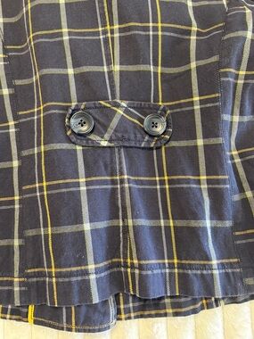 Classic double-breasted women's peacoat in a navy plaid with yellow accent lines. Tailored fit with structured collar and button-front closure. Functional front pockets and a polished silhouette for everyday and work wear. Versatile navy color that pairs easily with denim or trousers.