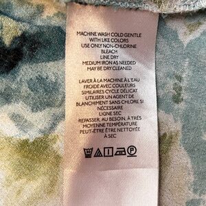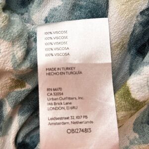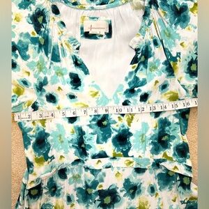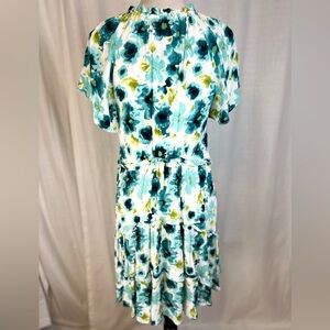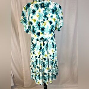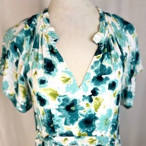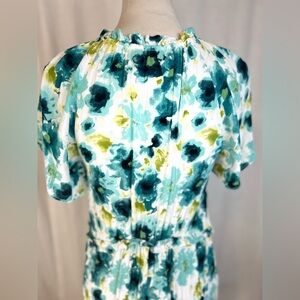 V-neck midi dress with short flutter sleeves. Defined waist and flowing tiered skirt. Painterly floral print in teal, white, and lime. Lightweight fabric for comfortable wear.