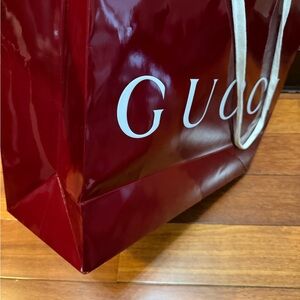 Elegant Gucci shopping bag in deep red. Features white handles and prominent logo.