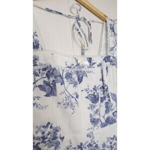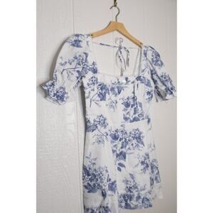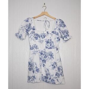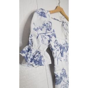 REFORMATION Evianna Linen Blue & White Toile Puff Sleeve Mini Dress US 10 NWT