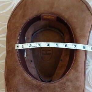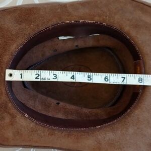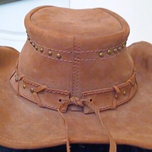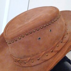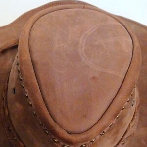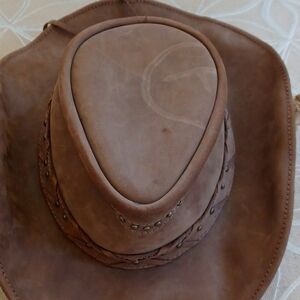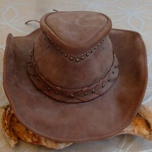Bullhide Burnt Dust Leather Western Hat. Brown, genuine top grain distressed leather, woven trim, and silver tone accents with vented crown and shapeable wire hat rim. The first few pictures were taken indoors with lights on, but the color is closest to the last few pictures, which were taken indoors in the sunlight. In great pre-owned condition, with natural makings on the leather!!