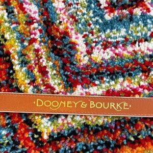 Dooney & Bourke textured cream leather belt with brown stitched accent. Features gold-tone buckle and branded medallion. Elegant, versatile accessory for polished looks. Secure buckle closure with decorative detailing.