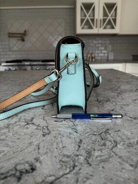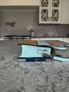 Purse: Light blue and tan faux wicker leather design. Adjustable crossbody strap. Zippered pocket on back. Magnetic snap closure Two large slip pockts in main compartment. Key ring