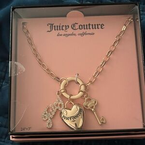 Gold-tone Juicy Couture necklace with heart and logo charms. Chunky link chain and toggle clasp. Polished finish with signature brand charm. Feminine and statement-making.